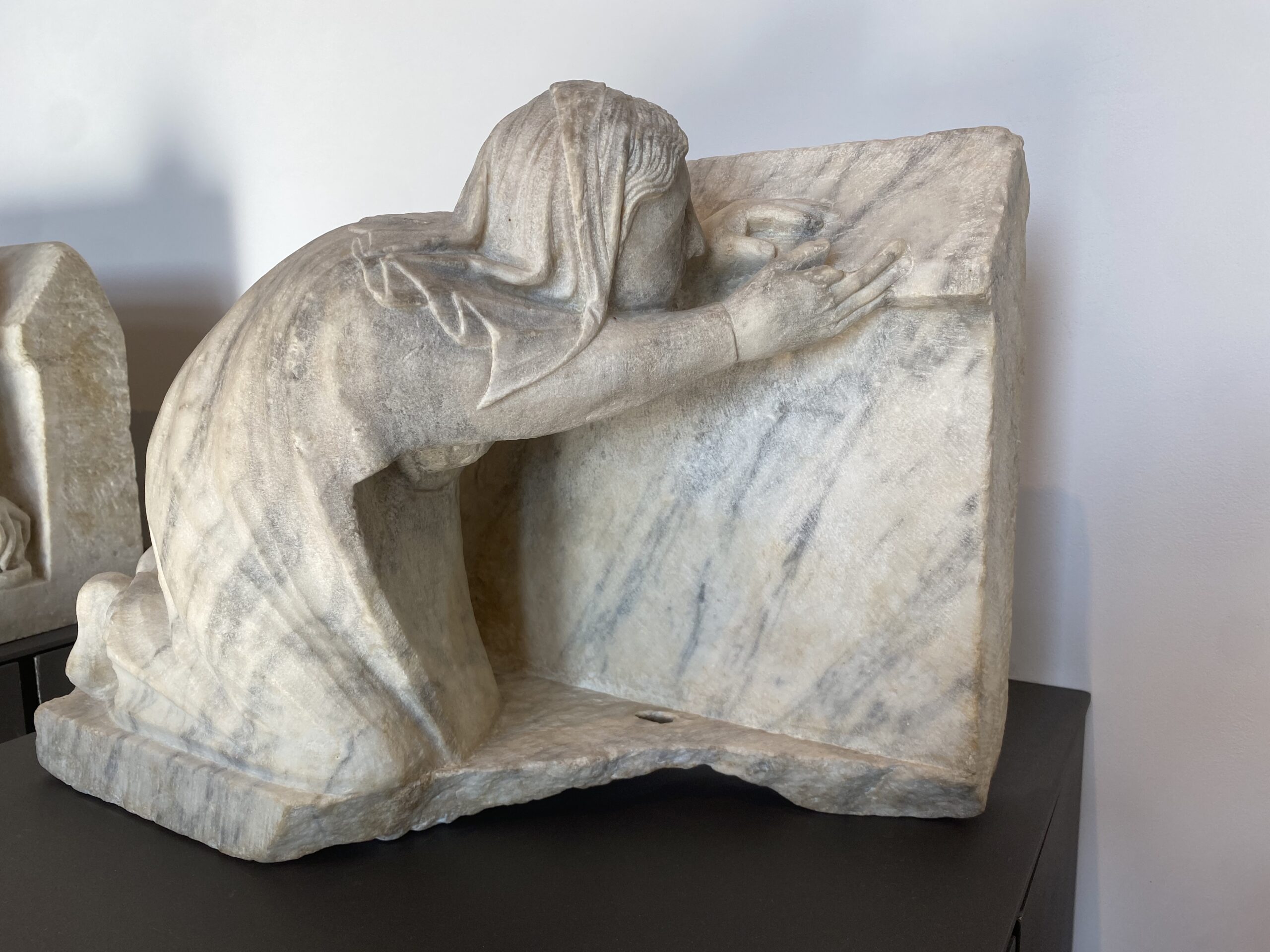 Nella seconda formella il pescatore è invece ritratto in piedi, mentre procede verso destra con una borraccia a tracolla e la cesta piena di pescato.
