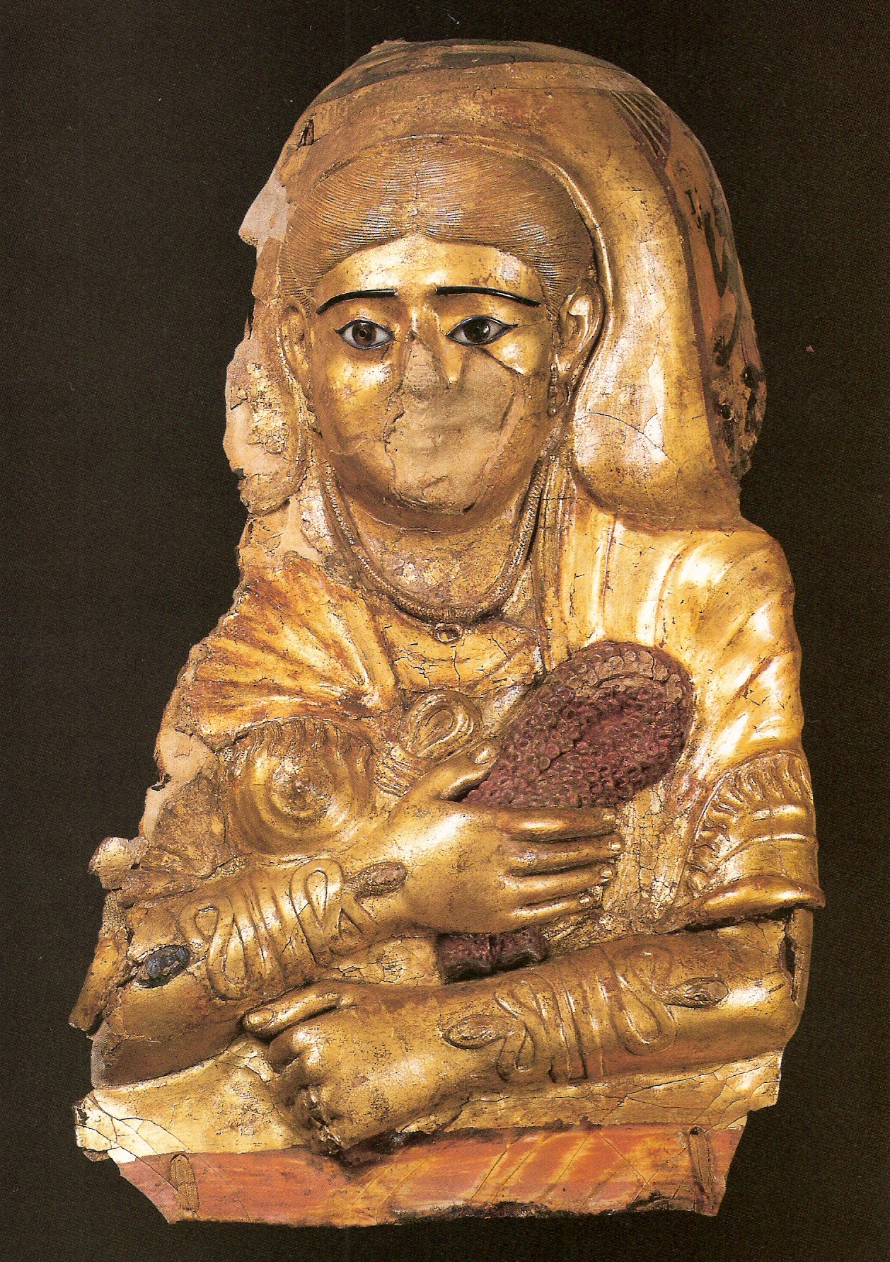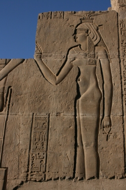 In Egypt, around the end of the Ptolemaic reign, Isis appears highly assimilate to Aphrodite, often-portrayed nude, with a basileion on her head. She is depicted as either wearing her hair loose or gathered in a bun, an elegant hair style called “the Libyan style.”