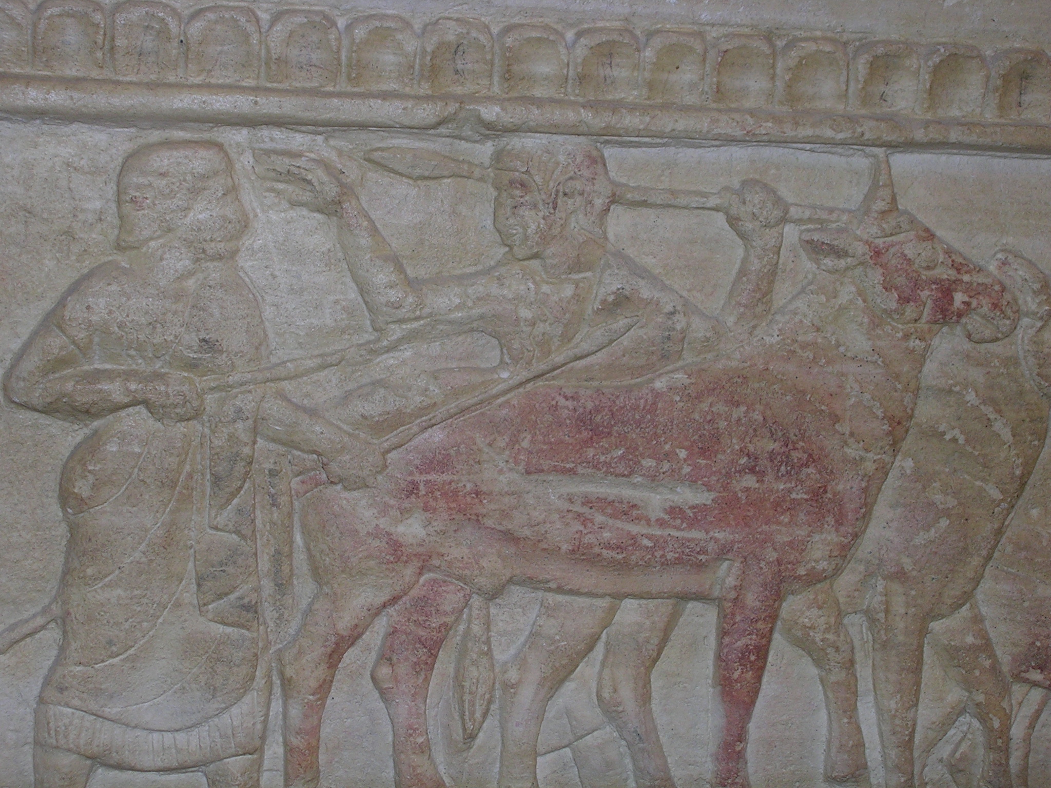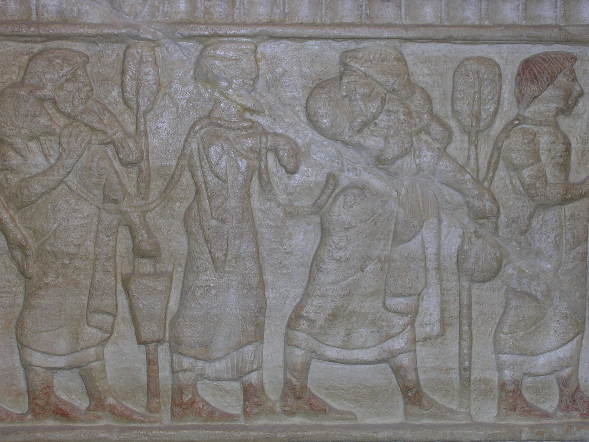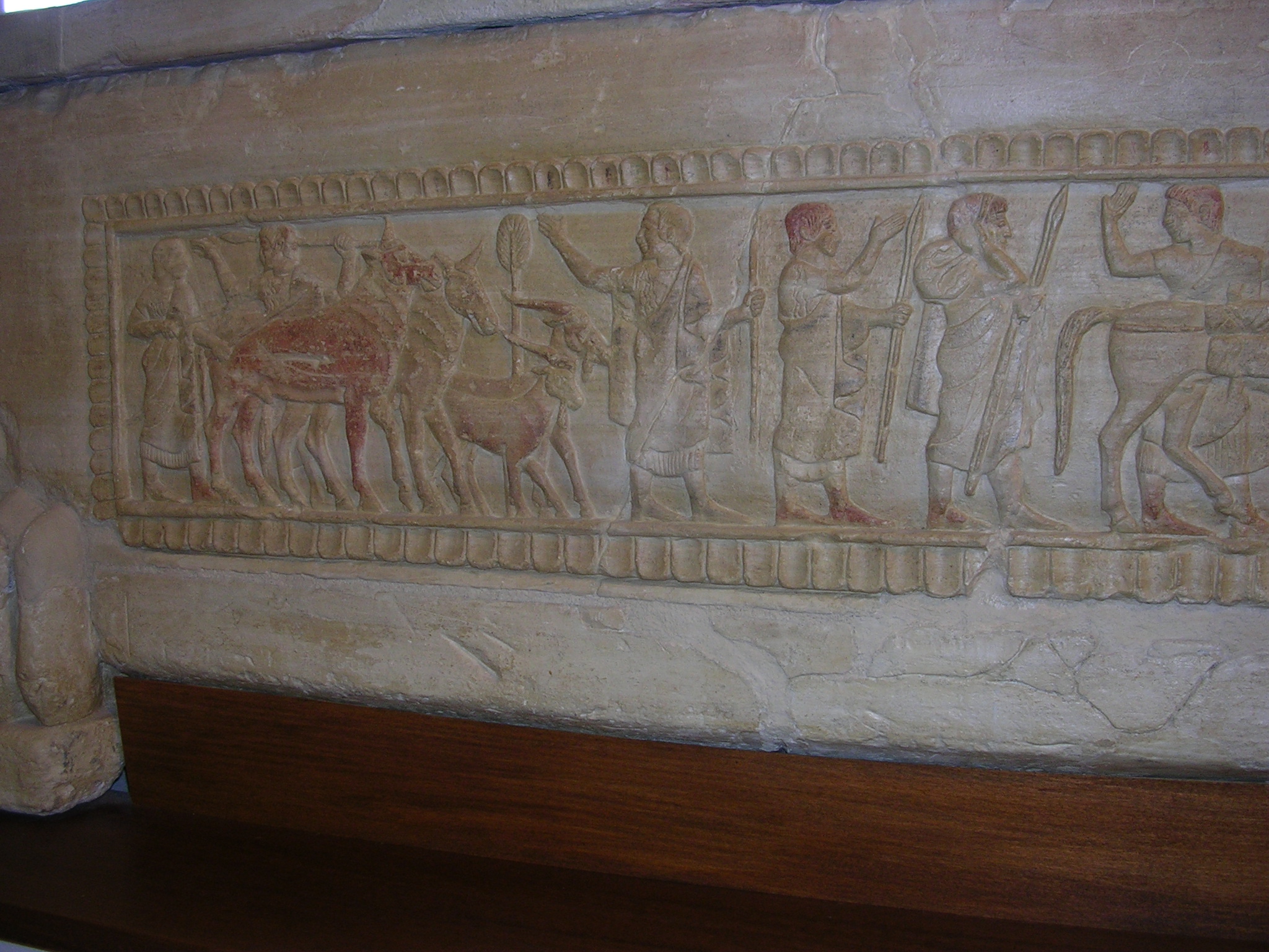 Let us dwell now on the main stage that runs along the side of the sarcophagus, which is without doubt the most enigmatic and perhaps the most interesting of them. We see depicted a true and proper parade, animated by men, women and animals which proceed neatly from left to right.