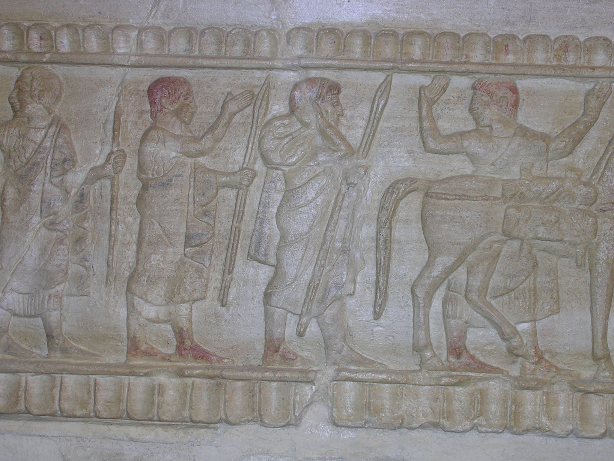 The scene of the procession might also represent the migration of a group of aristocrats from Chiusi to Perugia, referring to the age of the Etruscan king Porsenna. Or it could document the memory of the Etruscans who migrated to the territories of the Po Valley. In a similar regard, you might recall the legends of the founding of cities such as Perugia, Bologna and Mantova, which also mention Servio in reference to how Ocnus, to avoid quarreling with his brother Auleste (legendary founder of Perugia), decides to leave to found Felsina (Bologna) and Mantua (Mantova).