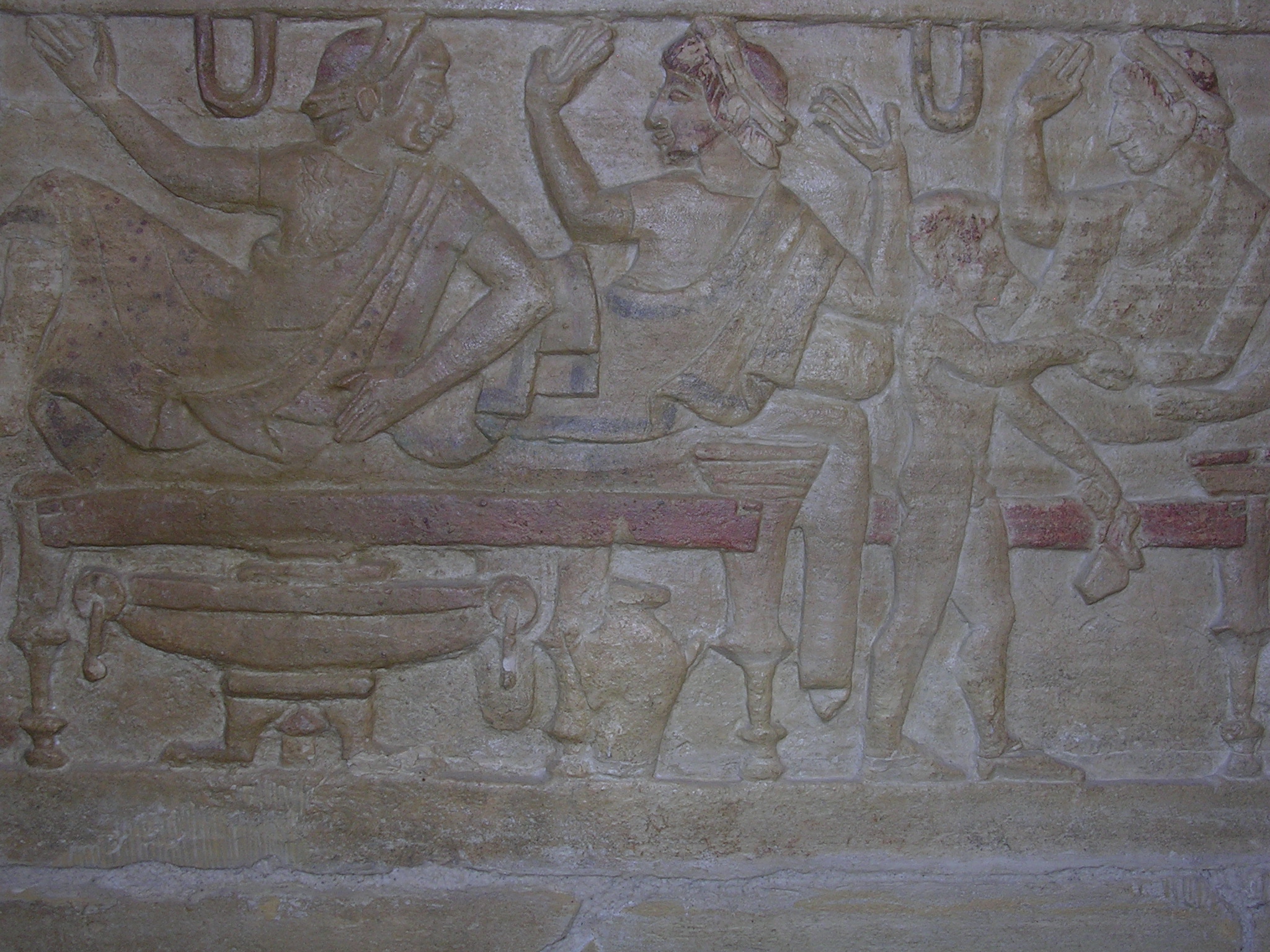 Looking closely at the sides of the sarcophagus, in fact, we note three male figures lying on a bed (kline), with their left elbow resting comfortably folded on a cushion between the body and the arm. With a friendly and intimate gesture, the man at the center of the scene rests his right hand on the shoulder of his companion, who is in front of him. The latter, however, with the right holds a kilix (ceramic wine cup), in the typical attitude of one who is involved in the Etruscan game kottabos. A third character plays a lyre, while at the foot of the bed he decants wine to a glass and a jug, and a very young nude slave serves the banquet. It seems a purely convivial scene, but in reality we know that the Etruscan banquet was also something very spiritual, connected to religion and the cult of the dead. It might also seem strange that symposium figures depicted on the sarcophagus are only men, yet it is only since 500 BC that the banquet scenes found in Etruscan tombs represent female figures among the participants in the symposium. One thing is certain: the banquet scene was meant to expose the high social status of the deceased.