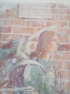 Entrando all’interno del santuario mi accade ogni volta di scoprire un nuovo dettaglio. Eppure mai prima d’ora mi ero accorta dell’iscrizione che sormonta il bellissimo angelo affrescato sulla parete destra. Si tratta indubbiamente dell’arcangelo Gabriele, raffigurato in ginocchio e di profilo, con un giglio in mano. Purtroppo la figura della Vergine annunciata, che certamente gli era di fronte, è andata perduta.