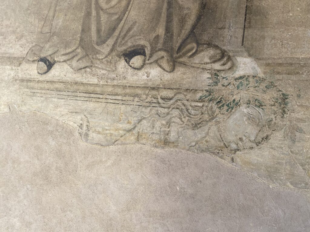Tale interpretazione tuttavia non mi convince. Osservando infatti quel che resta dell’enigmatica figura dipinta ai piedi del Giudice, mi sono tornate in mente altre immagini pittoriche che fotografai anni fa durante i miei viaggi tra Umbria e Toscana.