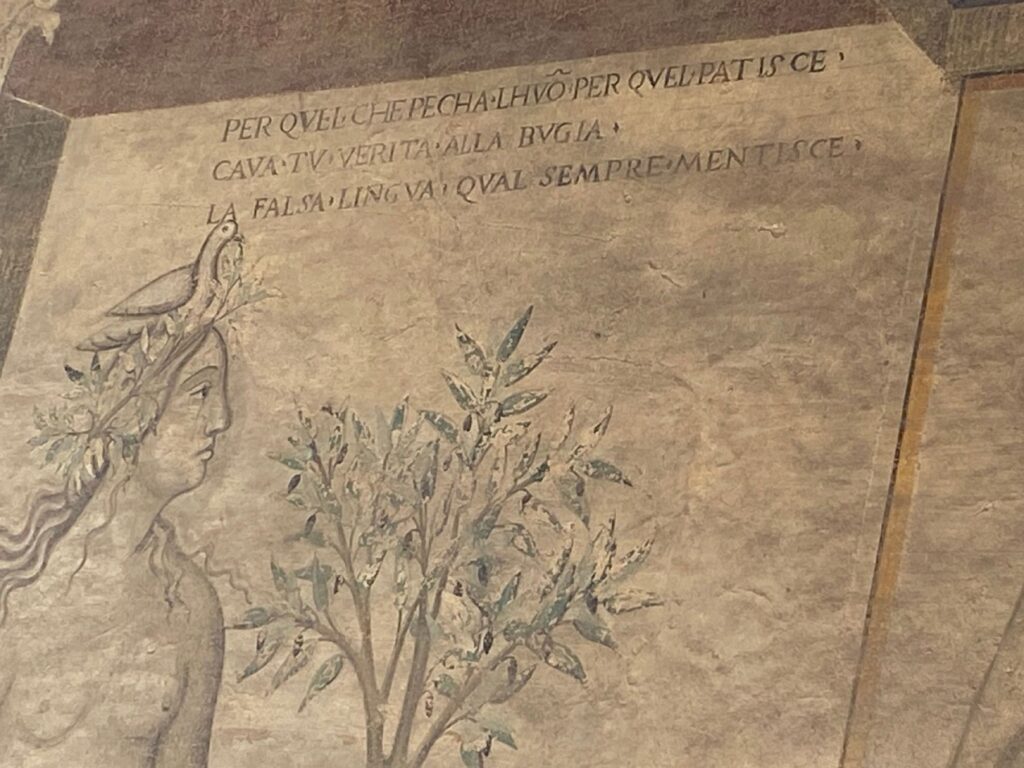 Nella parte superiore dell’affresco si legge chiaramente: PER QUEL CHE PECHA L’H(U)O(M) PER QUEL PATISCE / CAVA TU, VERITA’, ALLA BUGIA / LA FALSA LINGUA QUAL SEMPRE MENTISCE. L’iscrizione è posta in alto a sinistra, al di sopra dell’allegoria della Verità, rappresentata da una figura femminile nuda che reca un cartiglio arrotolato nella mano destra. Il capo è cinto da una ghirlanda di foglie d’ulivo ed è sormontato da una bianca colomba. Un drappo le cade dalle braccia coprendole il basso ventre, e nella mano sinistra sostiene un lungo ramo d’ulivo, pieno di foglie e frutti maturi.