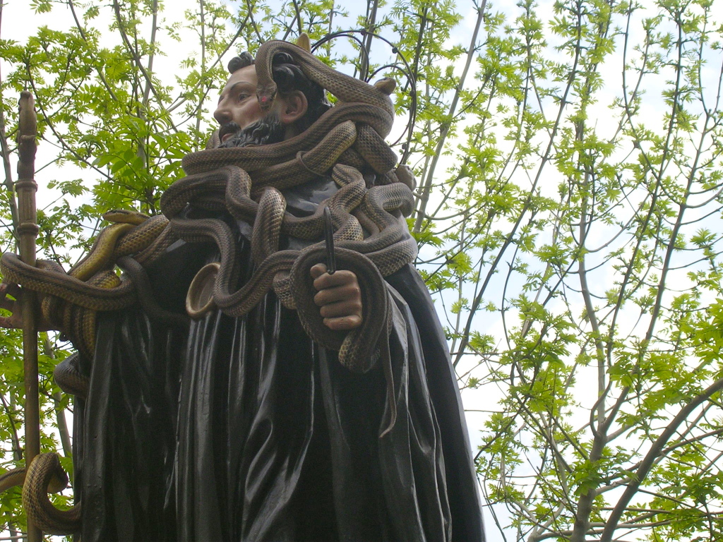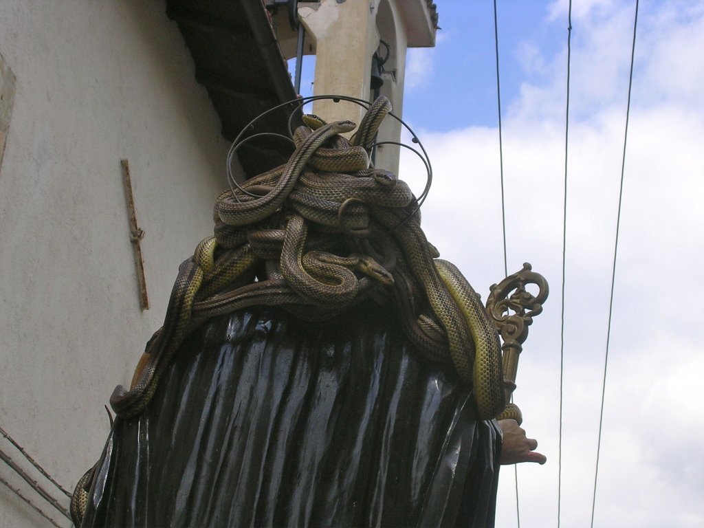 All’inizio di maggio, nel comune abruzzese di Cocullo, il simulacro del santo patrono di origini umbre viene portato in processione ricoperto da serpenti.