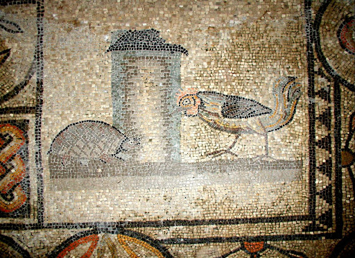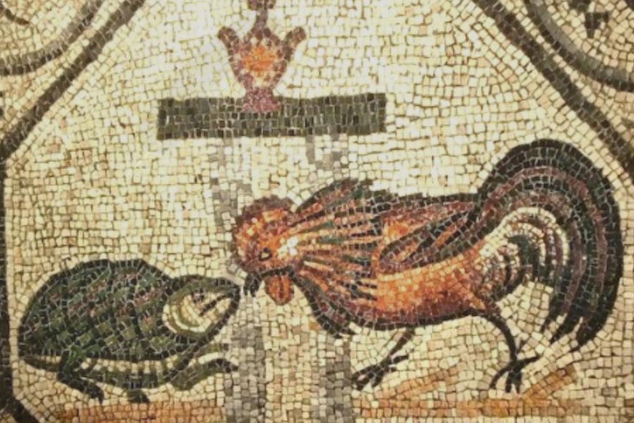 Il gallo, invece, pur essendo un animale dalla vivacità aggressiva, ha il compito di cantare al sorgere del sole per annunciare un nuovo giorno. Il nuovo giorno è la venuta di Cristo, “luce del mondo”, quindi il gallo è portatore della buona novella e simbolo del bene. Nell’aula nord, alle spalle dei due animali, il musivarius ha posto una colonnina recante una piccola anfora, quale premio per il vincitore. L’anfora, secondo gli usi pagani, doveva contenere un olio prezioso. Ricordiamo a questo proposito le anfore panatenaiche, colme di vino sacro, che venivano date in premio agli atleti vincitori nelle gare in onore di Athena Parthenos in Atene. La versione dell’aula sud, invece, vede sostituito all’anfora un sacchetto di denaro, su cui è appena distinguibile una cifra : –CCC. Anche questa cifra va letta in modo simbolico riferita alla Trinità, — = infinito, CCC = Trinità, quindi infinita Trinità. Questa iconografia potrebbe derivare dal culto pagano del dio Mithra ed è veramente insolita nell’arte a contenuto cristiano. In ogni caso il premio offerto al vincitore allude al dono della vita eterna che il cristiano riceverà se sarà riuscito a vincere il male combattendo il peccato.